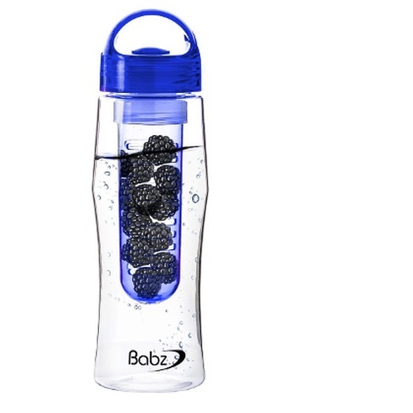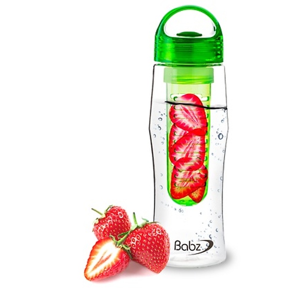 Mit der praktischen Kunststoff-Flasche für unterwegs lässt sich Wasser mit immer neuen Obstsorten geschmacklich aufpeppen