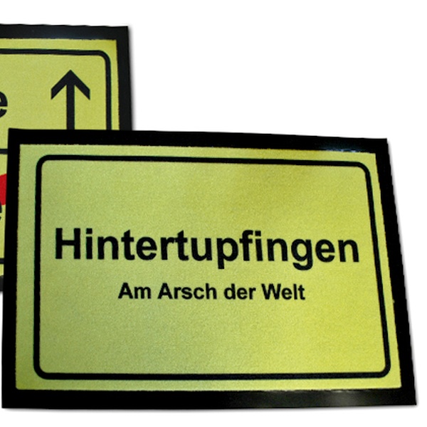 - Nach Belieben in Form eines Ortsschilds (Ortseingangs- oder ausgangsschild) bedruckbar