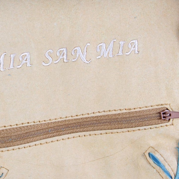 Versteckte Reißverschlusstasche innen am Latz, bestickt mit: MIA SAN MIA