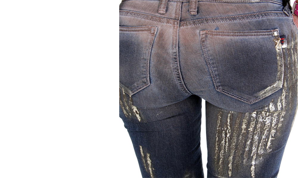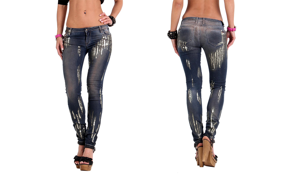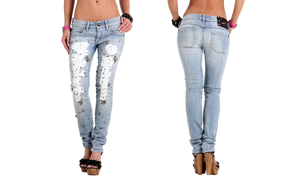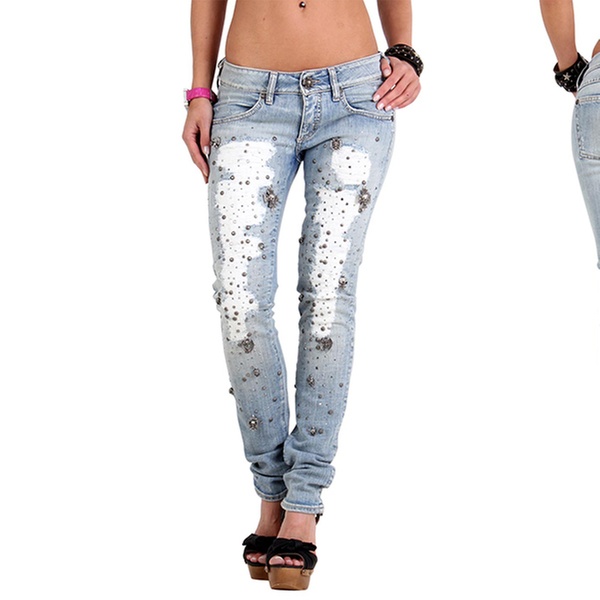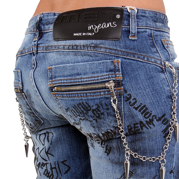 - Details: doppelter Knopfverschluss und Reißverschluss, 2 Seiten- und 2 Gesäßtaschen, Usedstyle, mit Strass-Steinchen und Nieten besetzt, verzierte Gürtelschlaufen an der Vorderseite, Met Logo an der Bundrückseite mit eleganten Strass-Steinchen besetzt