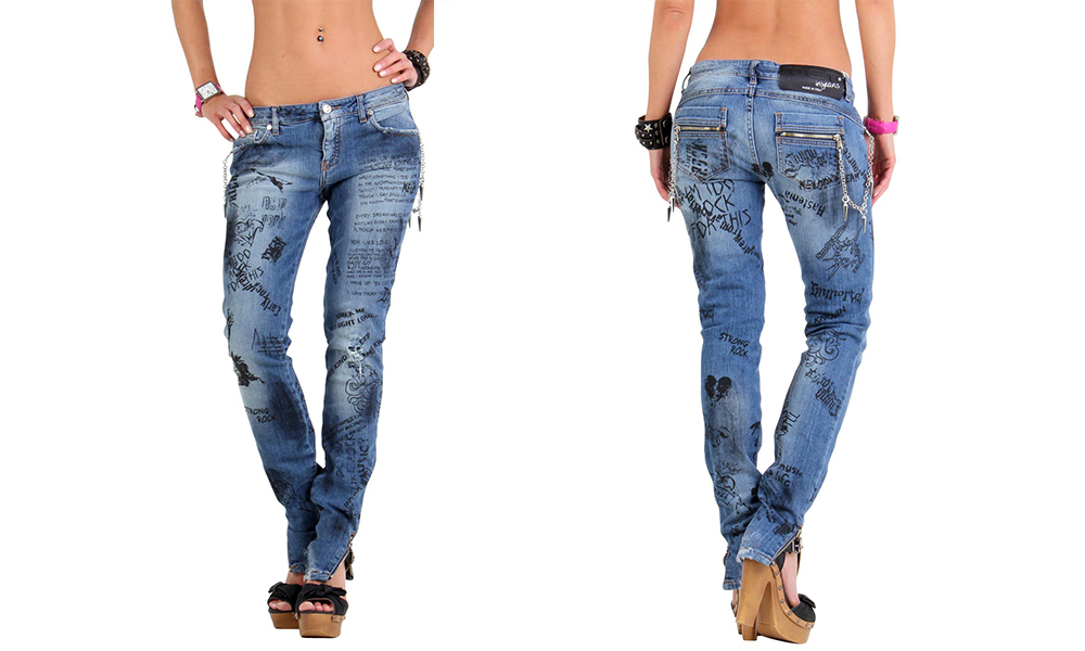 - Details: Knopfverschluss mit Strass-Stein und Reißverschluss, 2 Seiten- und 2 Gesäßtaschen, Vintagestyle, Gürtelschlaufen an der Vorderseite mit Zier- und Strass- Steinchen verziert, Strass-Steinchen auf den Hosenbeinen, glitzerndes Met Logo an der Bundrückseite