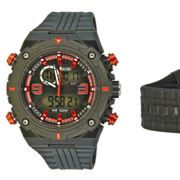 Qualitätsuhr mit Quarz-Uhrwerk, Digitalanzeigen und Polyurethan-Armband aus robusten Materialien wie Edelstahl und Polycarbon
