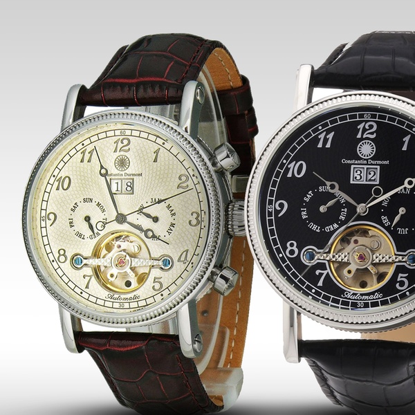 Elegantes Automatikwerk im Chronographen-Look mit Edelstahlgehäuse, Mineralglas und Kalender-Funktion sowie Lederarmband oder Milanaise