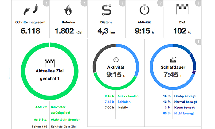 - Aufzeichnen von Kalorienverbrauch, zurückgelegter Strecke und Aktivitätsdauer