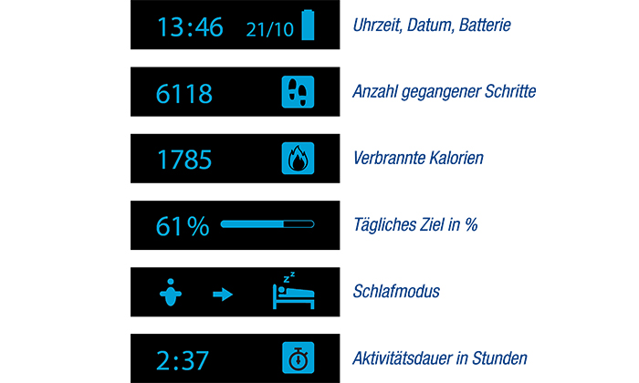 Ziele setzt sich jeder Mensch im Leben: ein Haus bauen, einen Baum pflanzen – und täglich aktiv sein. Wer ganz genau wissen möchte, wieviel Kalorien denn tatsächlich pro Gang zur Pizzeria verbrannt werden, erhält jetzt die Daten vom hochsensiblen Bewegungssensor des Medisana ViFit Activity Trackers. Mit diesem werden die Anzahl der Schritte, die zurückgelegte Strecke, die verbrannten Kalorien, die Gesamtbewegungszeit und der Status des täglichen Bewegungsziels in Prozent (%) gemessen. Im Schlafmodus werden zusätzlich die Bewegungsaktivität während des Schlafs und die Schlafdauer erfasst. Angezeigt wird alles im OLED-Display. Im kostenlos nutzbaren VitaDock Online-Portal oder der VitaDock+ App für das Smartphone können die Daten zudem übersichtlich gespeichert, abgerufen, ausgewertet und exportiert werden.