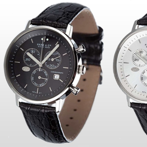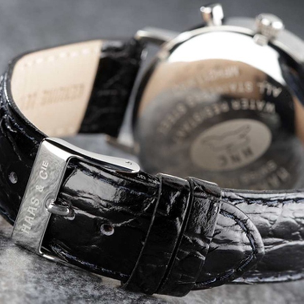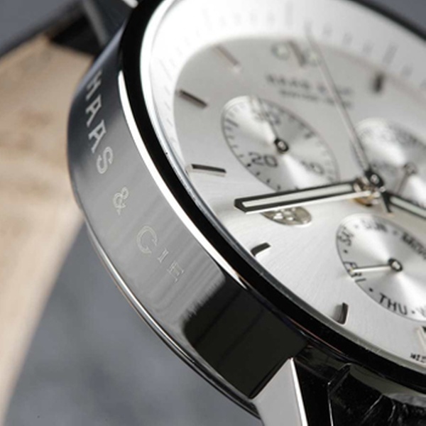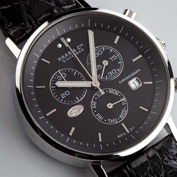 Mit dem Vitesse Chronograph Quarz von Haas & Cie weiß der Mann von Welt immer und überall, was die Stunde geschlagen hat. Das elegante schwarze Lederarmband hält das leichte aber robuste Edelstahlgehäuse sicher an Ort und Stelle. Durch das stoß- und kratzfeste Mineralglas geschützt, geben die fluoreszierenden Zeiger auf dem gebürsteten Ziffernblatt in wahlweise Schwarz oder Silber Tag und Nacht präzise Auskunft über die aktuelle Uhrzeit - dafür sorgt das Schweizer Uhrwerk von ISA.