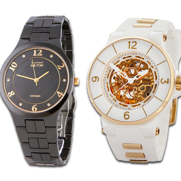 Abwechslungsreiche Auswahl analoger Keramik-Armbanduhren für Sie und Ihn in Kombinationen aus Schwarz, Weiß und Gold