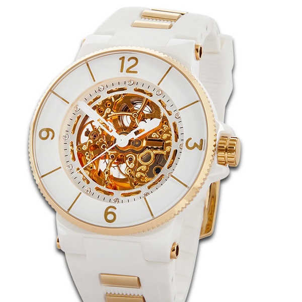 - Bandmaterial: Keramik und Edelstahl, Farbe Weiß und Gold