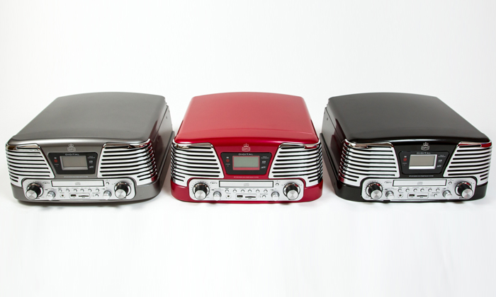 - Plattenspieler mit MP3-Player, FM-Radio und CD-Deck im angesagten Design der 1950er