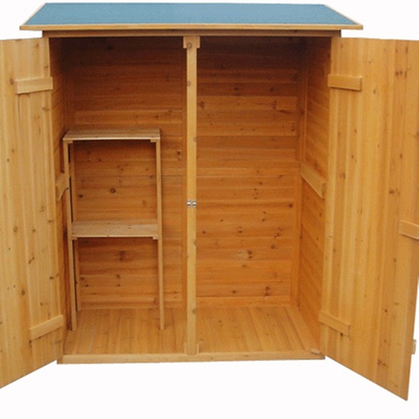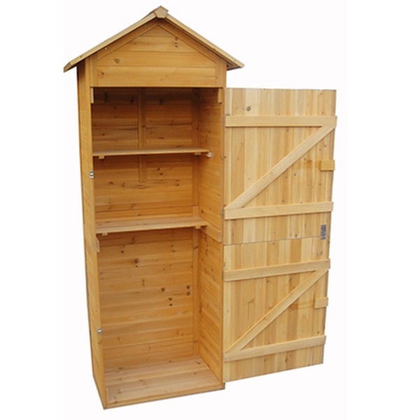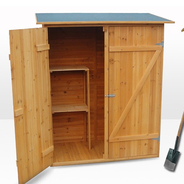 In den komplett aus Holz gefertigten Gerätehäusern mit praktischem Innenregal lassen sich Gartenutensilien witterungssicher aufbewahren