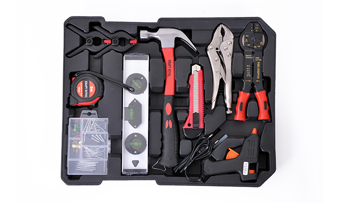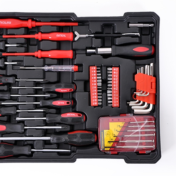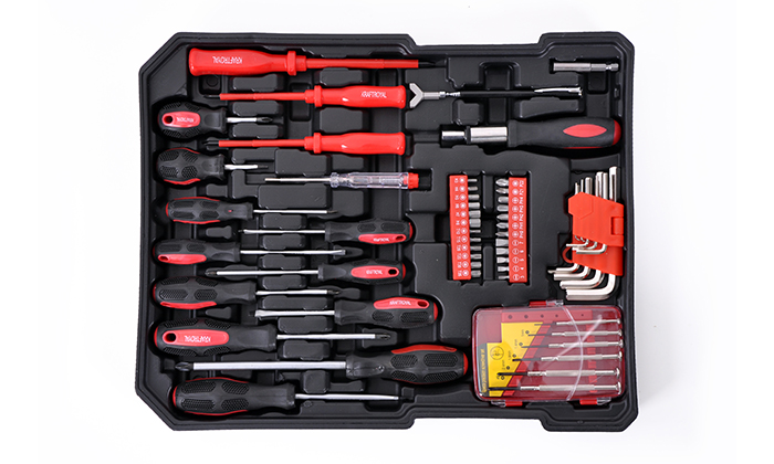 Verpackt im stabilen Alutrolley mit Rollen und Schloss lässt es sich mit 186 Werkzeugteilen aus robustem Chrom-Vanadium-Stahl gut Heimwerken