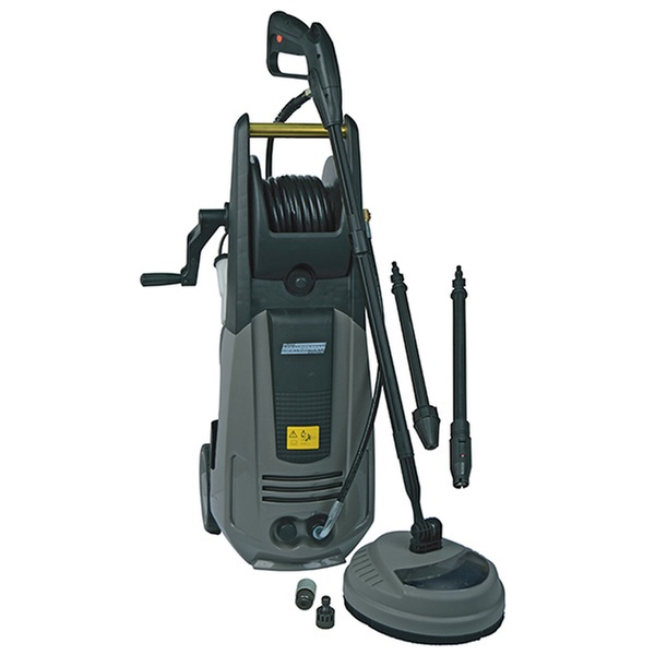 Reinigt diverse Oberflächen mit einem 5 m langen Hochdruckschlauch sowie Flächenreiniger, Dreckfräse und Vario-Sprühlanze