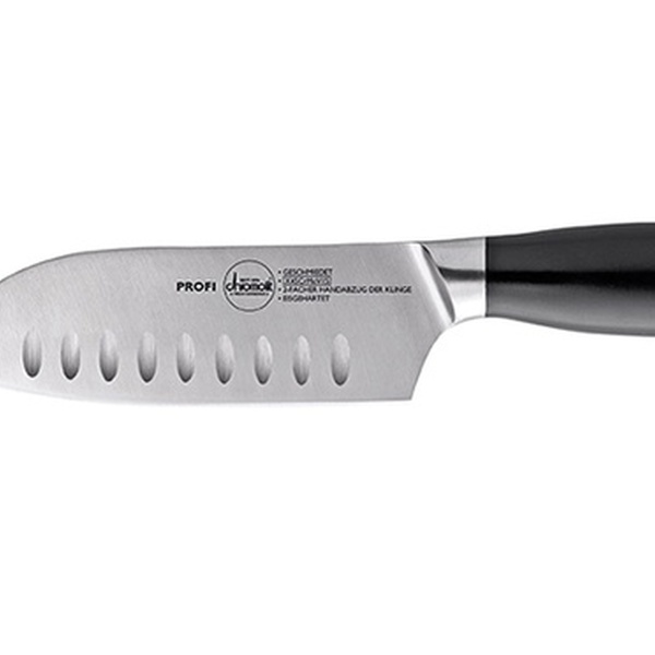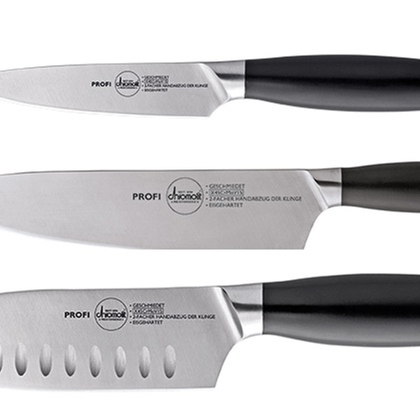Das Profi-Messerset aus Edelstahl beinhaltet ein Santoku-Allzweck-, ein Gemüse- und ein Kochmesser