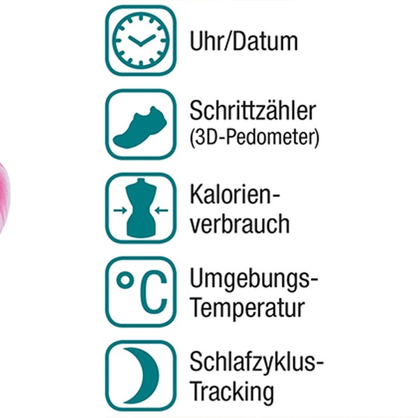 - Erfasst Schritte (3D-Pedometer), Kalorienverbrauch, Umgebungstemperatur und Schlafqualität