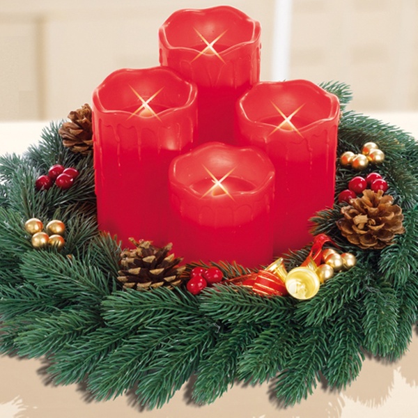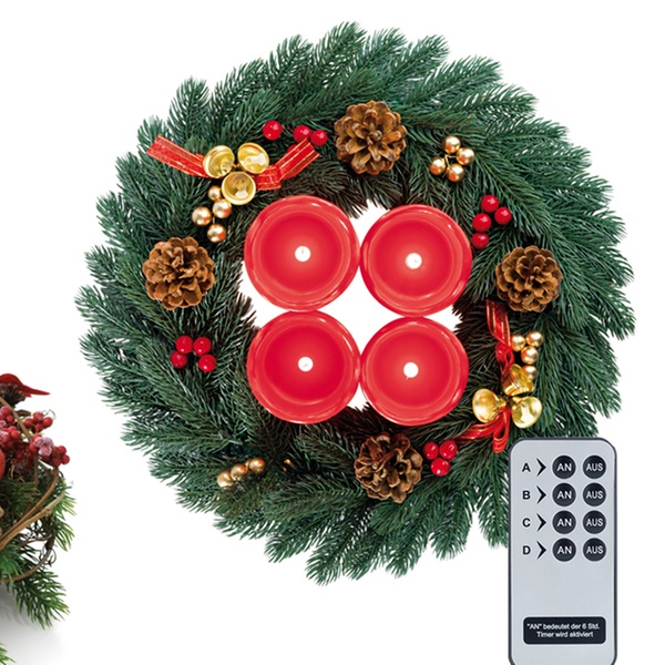 - Lieferumfang: 4 Echtwachs-Kerzen (verschiedene Größen), 8 Batterien (1,5 V, Typ AA), 1 Deko-Adventskranz (künstlich), 1 Fernbedienung mit Lithium-Knopfzelle (3 V, Typ CR2032)
