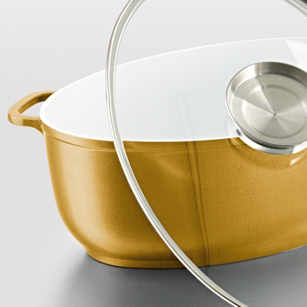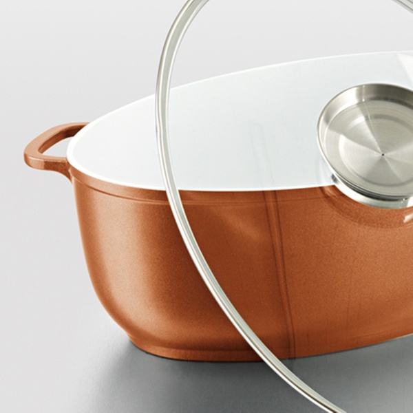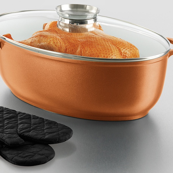 Der Bräter mit Antihaftbeschichtung und Aromaknopf zum Einfüllen von Flüssigkeiten ist kupferfarben oder in der Gold Edition erhältlich