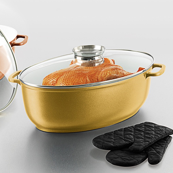 bratmaxx Keramik-Aromabräter mit Glasdeckel und Handschuhen, Gold Edition
