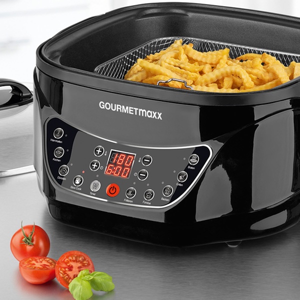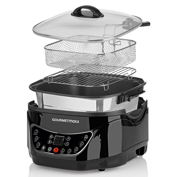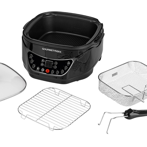 - Lieferumfang: 1 Multikocher mit Netzkabel, 1 Schüssel, 1 Grillrost, 1 Grillkorb, 1 Entnahmehilfe und 1 Glasdeckel