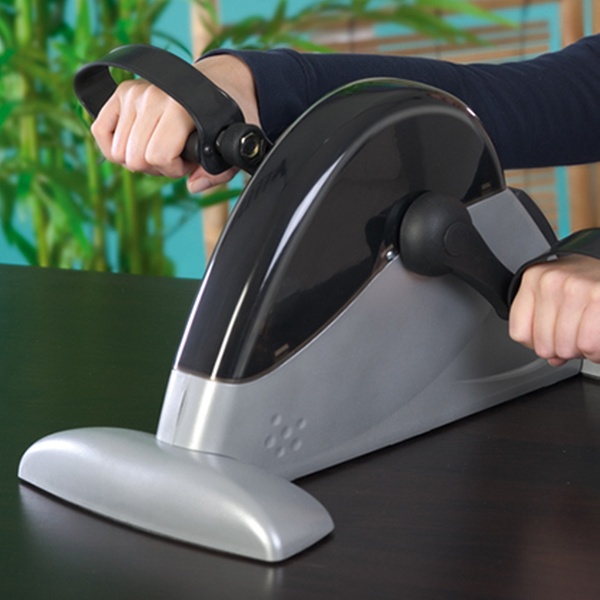 Der kompakte Trainer lässt sich zum individuellen Arm- oder Beintraining einfach vor den Fernsehsessel, unter oder auf den Tisch platzieren