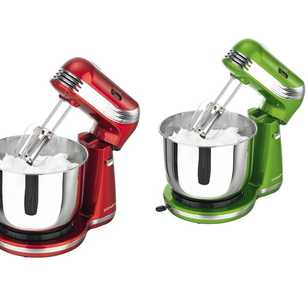 - Zubehör (spülmaschinengeeignet): hochwertige Edelstahl-Schüssel (3 l Fassungsvermögen), Schneebesen, Knethaken