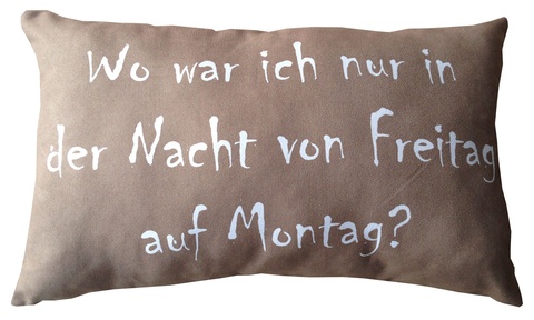 - Kissen mit Spruch „Wo war ich nur in der Nacht von Freitag auf Sonntag?“ für 13,90 €
