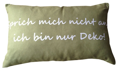 - Kissen mit Spruch „Sprich mich nicht an, ich bin nur Deko“ für 13,90 €
