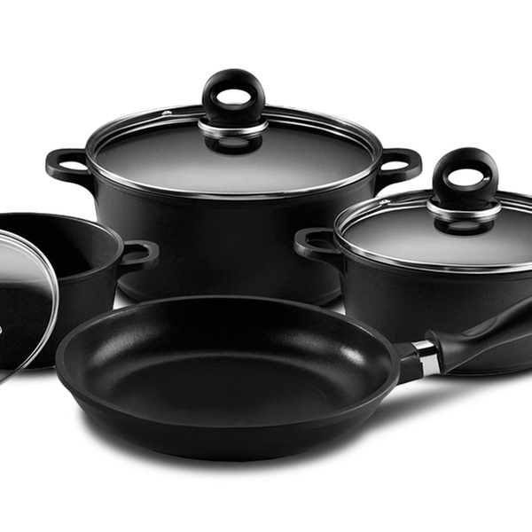 Massives und auch für Induktion geeignetes Aluguss-Set mit 3 Kochtöpfen und Glasdeckeln sowie Bratpfanne und Isogrip-Kochhandschuhe