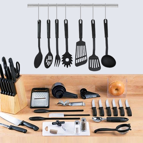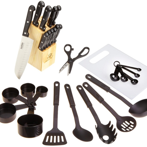 Set beinhaltet kompletten Messerblock, ein Schneidebrett, Messlöffel und Küchenmaße sowie diverse Pfannenwender und weitere Utensilien
