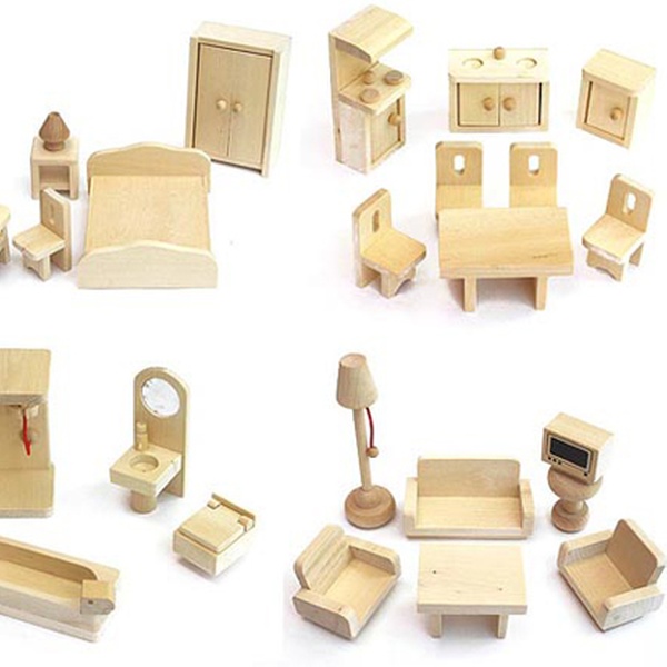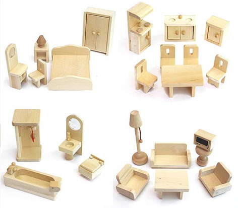 - Beispielmaße (L x B x H): Dusche: 6 x 6 x 10,5 cm; Sofa: 9,5 x 4,5 x 5 cm; Stuhl: 3 x 3,5 x 6 cm