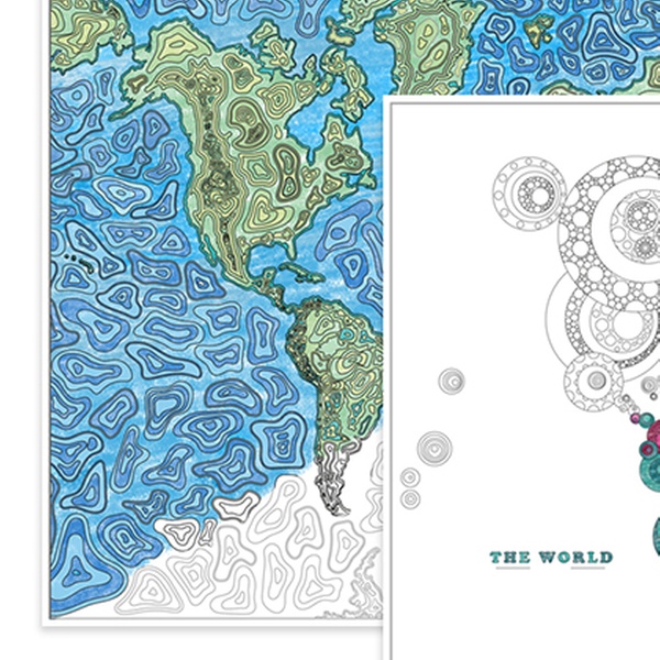 Weltkarten-Poster im besonderen Design bietet Entspannung und Kreativität durch langsames Ausmalen der Formen