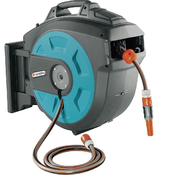 Platzsparende, 180° schwenkbare Wandhalterung mit automatischem Schlaucheinzug, 35 m-Schlauch, 2 m-Anschlussschlauch und Spritze
