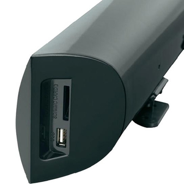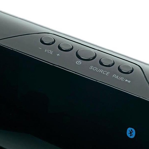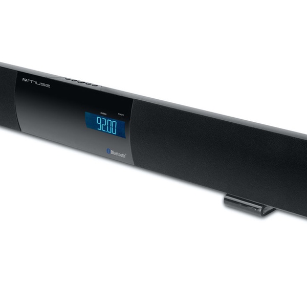 Die Soundbar in elegantem Schwarz verfügt über einen eingebauten Subwoofer, LCD-Display und eine Audio-Streaming-Funktion mit Bluetooth