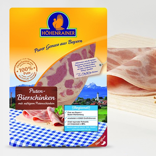 Zutaten Puten Bierschinken: 86% Putenfleisch, Trinkwasser, Nitritpökelsalz (Salz, Konservierungsstoff: Natriumnitrit), 2% Rapsöl, Dextrose, Glukosesirup, Stabilisatoren: Natriumcitrate, Diphosphate; Gewürze, Gewürzextrakte Antioxidationsmittel: Ascorbinsäure, Natriumascorbat. Nährwert pro 100 g: Energie kJ (kcal) 651 (156), Eiweiß 15,0 g, Kohlenhydrate 1,5 g, davon Zucker 1,2 g, Fett 10,0 g, davon gesättigte Fettsäuren 3,5 g, Salzgehalt 2,2 g.
