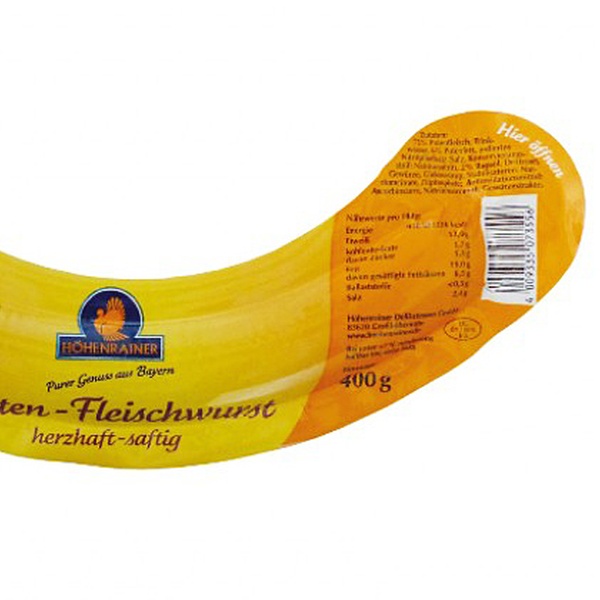 Zutaten Puten Paprika Fleischwurst: 70% Putenfleisch, 10 % Paprika, Trinkwasser, Nitritpökelsalz (Salz, Konservierungsstoff: Natriumnitrit), 2% Putenfett, 2% Rapsöl, Dextrose, Gewürze, Stabilisatoren: Natriumcitrate, Diphosphate; Glukosesirup, Antioxidationsmittel: Ascorbinsäure, Natriumascorbat; Gewürzextrakte. Nährwert pro 100 g: Energie kJ (kcal) 758 (183), Eiweiß 12,0 g, Kohlenhydrate 2,0 g, davon Zucker 1,2 g, Fett 14,0 g, davon gesättigte Fettsäuren 3,8 g, Salzgehalt 2,0 g.