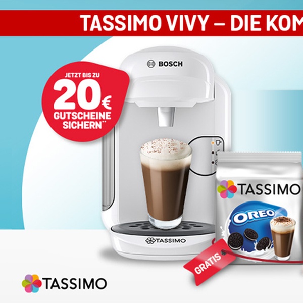 *VIVY nur 34,99 €. Unverbindliche Preisempfehlung des Herstellers: 109,99 €. Bitte beachten Sie, dass Sie nach Erhalt der Maschine diese erst auf www.tassimo.de registrieren müssen, um die Gutscheine zu erhalten. Nähere Infos und Teilnahmebedingungen finden Sie auf http://www.angebote.tassimo.de. Es gelten die allgemeinen Geschäftsbedingungen. Nur solange der Vorrat reicht!