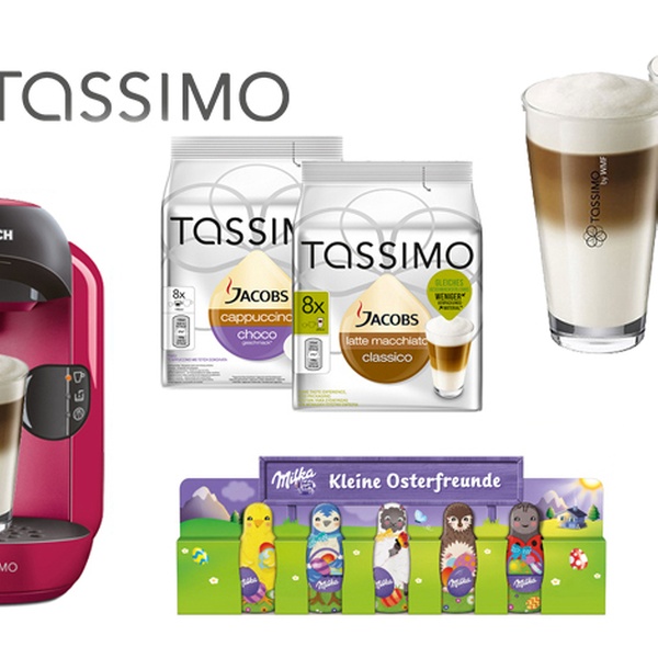 Jetzt limitiertes TASSIMO Oster-Special sichern! Es besteht aus einer TASSIMO Vivy inkl. eines WMF Gläser-Sets sowie jeweils einer Packung T Discs Jacobs Latte Macchiato Caramel, Caffè Crema intenso XL, Milka, Cappuccino mit Choco-Geschmack und café au lait.