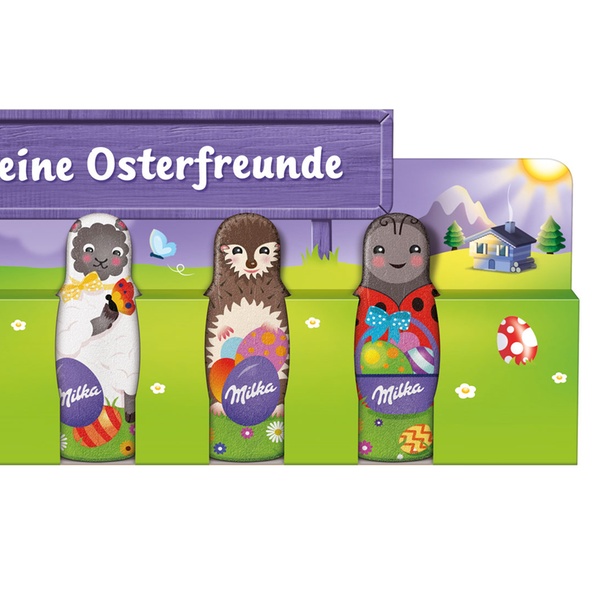 Ein echter Hingucker im Osternest ist der Milka Schmunzelhase 130g aus zarter Milka Alpenmilch Schokolade. Milka Kleine Osterfreunde 5 x 15 g
