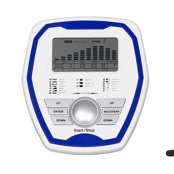 - Trainingscomputer mit Jumbo LCD-Anzeige (Trainingszeit, Strecke, Geschwindigkeit, Leistung in Watt, Trittfrequenz, Puls, ca. Energieverbrauch, Körperfettmessung, Erholungspuls-Messung mit Fitnessnote sowie 4 einstellbare Benutzerprofile, Speicherung von Alter, Körpergewicht, Größe und Geschlecht