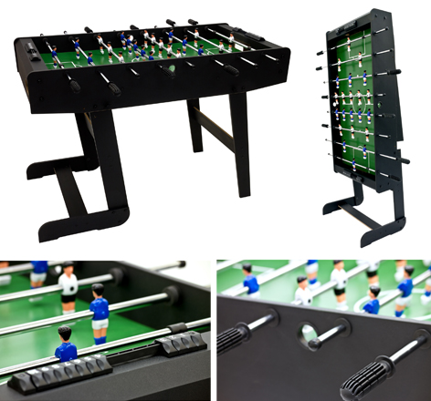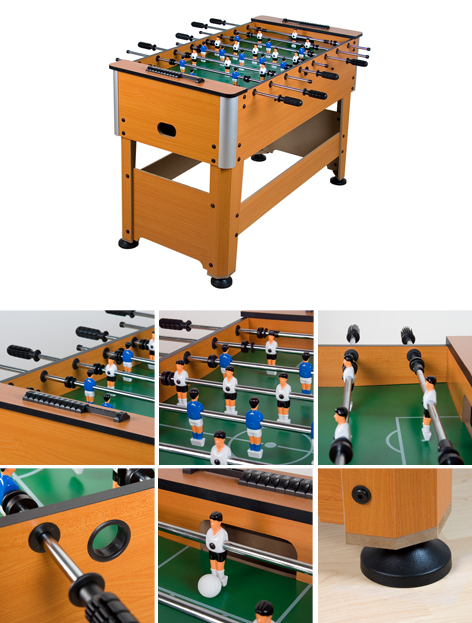 - Maße (ohne Stangen): L 140 x B 73 x H 87 cm, Gewicht ca. 70 kg; Spielfeld: L 118 x B 68 cm, Tore: 20 x 8 cm (jeweils Turniermaße)