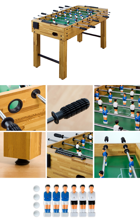 - 1 Kicker, 4 Bälle Ø 31 mm (weiß, angeraut), 6 Ersatzspieler (3 pro Team), Aufbauanleitung