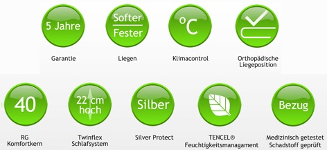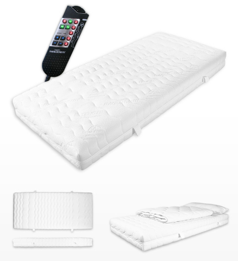Die orthopädische Medico-Twinflex-Matratze von medicotherm® mit 7 Liegezonen kann in dreizehn verschiedenen Maßen bis zu einer Größe von 200 x 200 cm erworben werden und ist mit einer integrierten oszillierenden Schwingungstherapie (ein im therapeutischen Bereich angewandtes Massageverfahren) ausgestattet. Da die Matratze außerdem mit zwei auf die unterschiedlichen Seiten verteilten Härtegraden daherkommt, passt sie sich den individuellen Bedürfnissen des Schlafenden an. Der SilverProtect-Matratzenbezug zeichnet sich durch drei aufeinander abgestimmte Materialien aus und sorgt für optimale hygienische Bedingungen. Ab einer Breite von 140 cm kann gegen einen Aufpreis von 149 € eine zweite Massage-Einheit eingebaut werden.