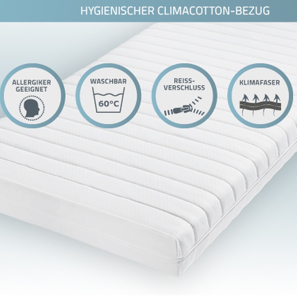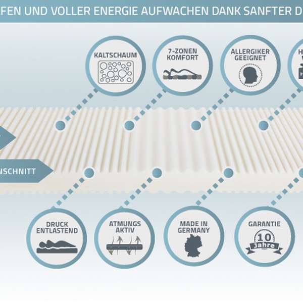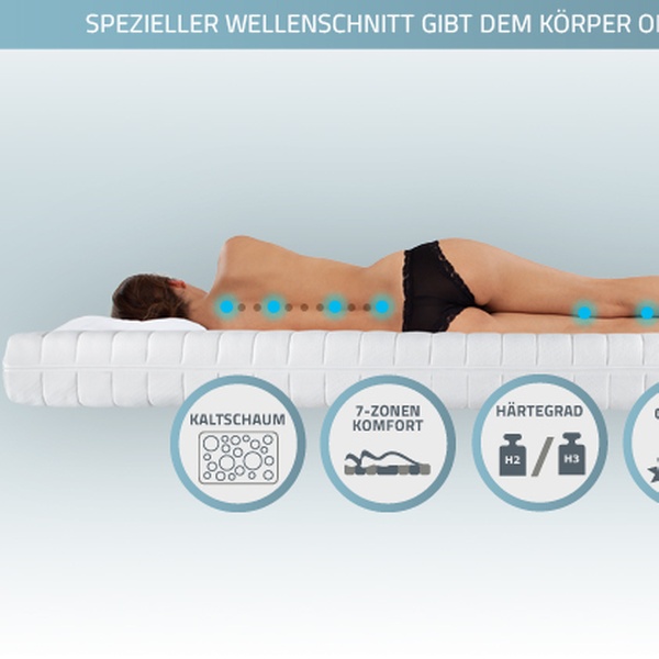 Markenmatraze mit ergonomischen 7-Zonen und Wellenschnitt, abnehmbarem waschbarem Bezug und 10 Jahre Herstellergarantie auf den Kern