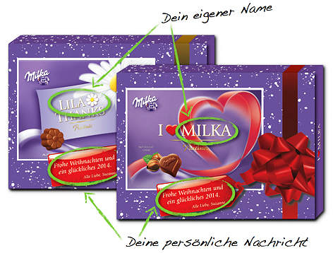 - Eine persönliche Botschaft und der Name des Schatzes auf der I Love Milka Box