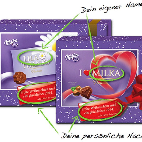 Süßes Dankeschön: Zum Fest der Liebe oder zwischendurch – mit zarten Schokoladenpralinen in einer individuellen I Love Milka oder Milka Thanks Box kann den Liebsten ganz einfach Danke gesagt werden. Die Schokogrüße Personalgifts mit wahlweise 110 oder 220 g der zartesten Versuchung können mit einer persönlichen Botschaft versehen werden.