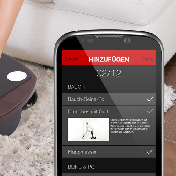 Nur 7 kg schwere und 1/3 Quadratmeter große Vibrationsplatte für zu Hause mit Poster und App zum intensiven Training