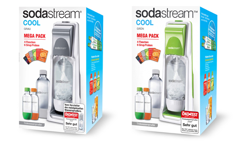 - Option 2: SodaStream Cool Megapack in Grün mit Alu-Zylinder, 4 PET-Flaschen und 2x 375 ml Sirup für 44,95 €