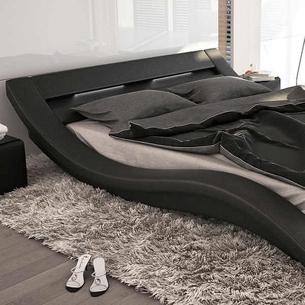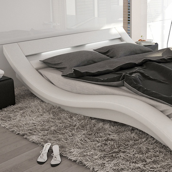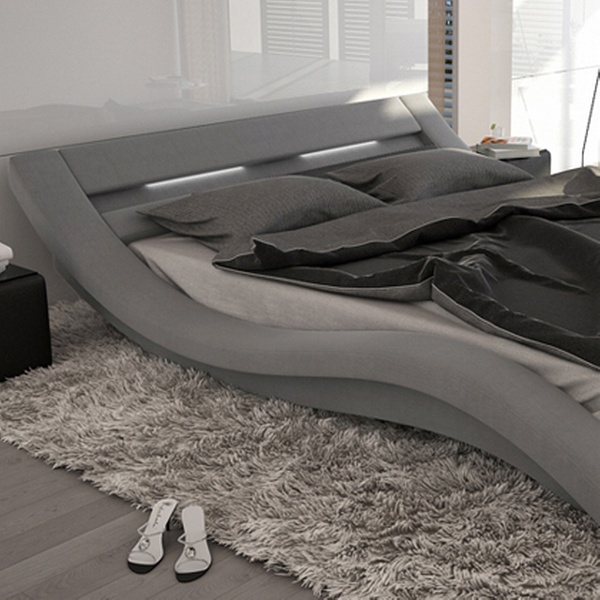 Extravagantes Bettgestell ohne Rost und Matratze in Schwarz, Weiß oder Grau mit stromlinienförmigen Konturen und LED-Beleuchtung im Kopfteil