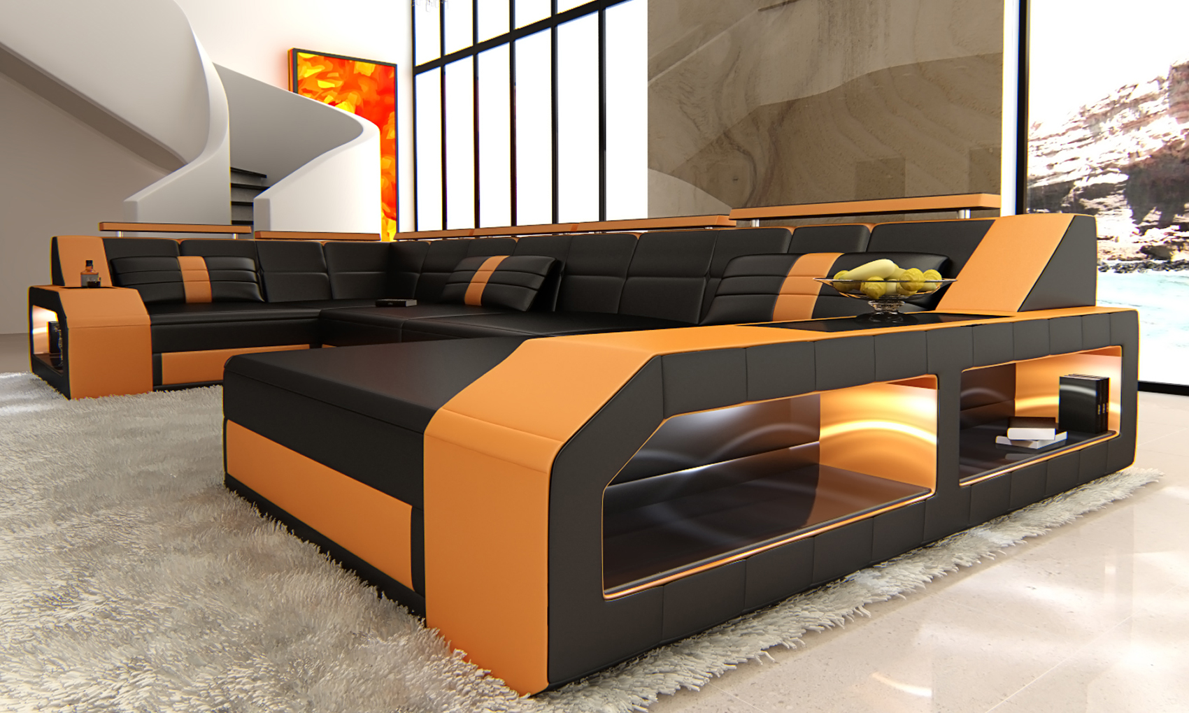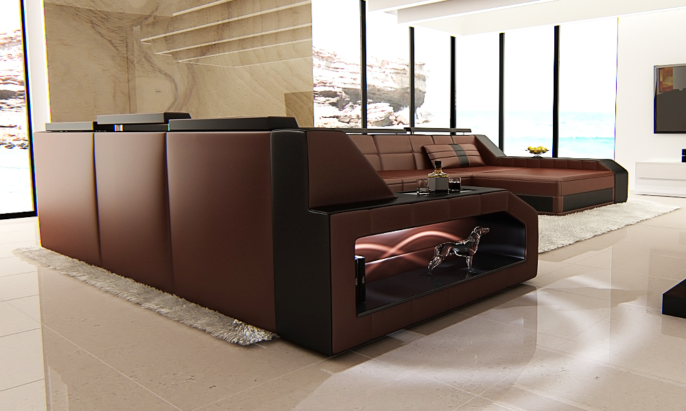 Die hochwertigen Designersofas besitzen eingebaute Ablageflächen aus lackiertem Holz und Beleuchtung an beiden Enden