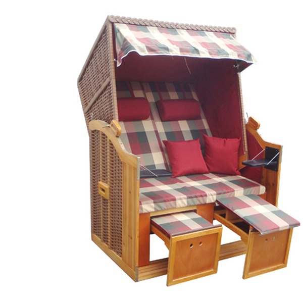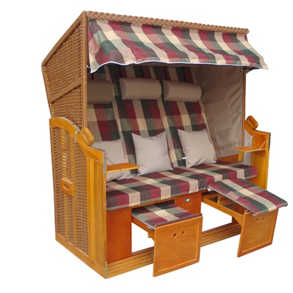 Klassischer Strandkorb aus Massivholz im Ostseestyle mit geschwungenen Seiten oder im Nordseestil mit geraden Seiten und komfortablen Extras