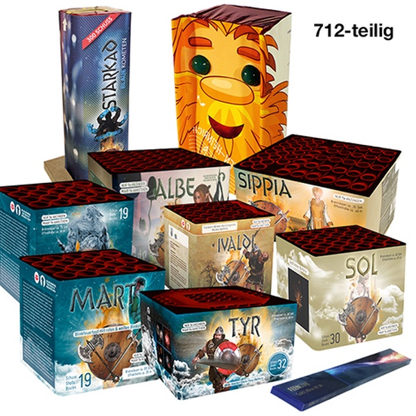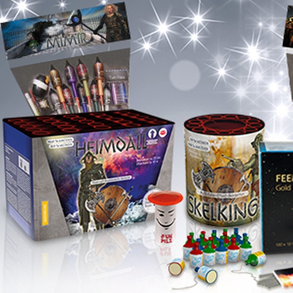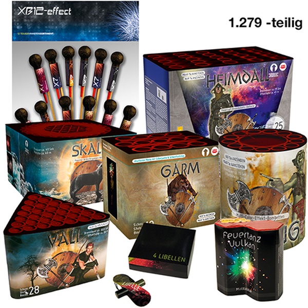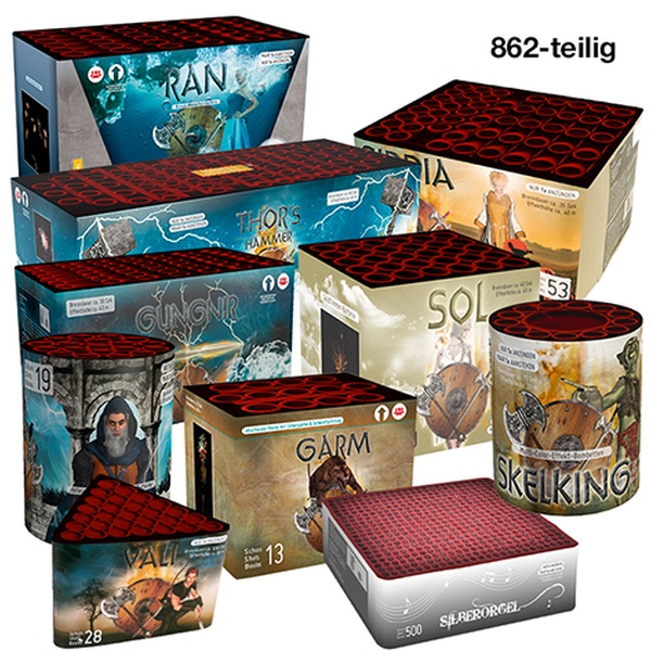 Feuerwerkssortiment 7: Leuchtfeuerwerk mit 2x Zwillingsfontäne und 2x 4er-Libelle. Systemfeuerwerk mit 1x Vali (28 Schuss), 2x Skelking (13 Schuss), 1x Kari (25 Schuss), 1x Heimdall (25 Schuss), 2x Garm (13 Schuss) und 1x Skalli (43 Schuss) Supercake. Systemfeuerwerk-Sortimente mit 1x Wikinger Koll (13er-Sortiment) Best of Cake. Raketen mit 1x XB12-effect (12 Bombenraketen im Beutel).